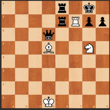 Позиция белых, на первый взгляд, явно проиграна. У черных подавляющий материальный перевес. Причем черные готовы взять слона белых на d5, с шахом. Ход белых, предлагаю найти мат в 2 хода. Подписывайтесь на канал, и будут новые интересные задачи Решение смотрите далее Более интересную задачу смотрите тут>>> 1. Белые дают шах ладьей на f8 1. ...... черные бьют королем на f8 2. Конь бьет h7 мат Подписывайтесь на канал Следующая задача тут>>