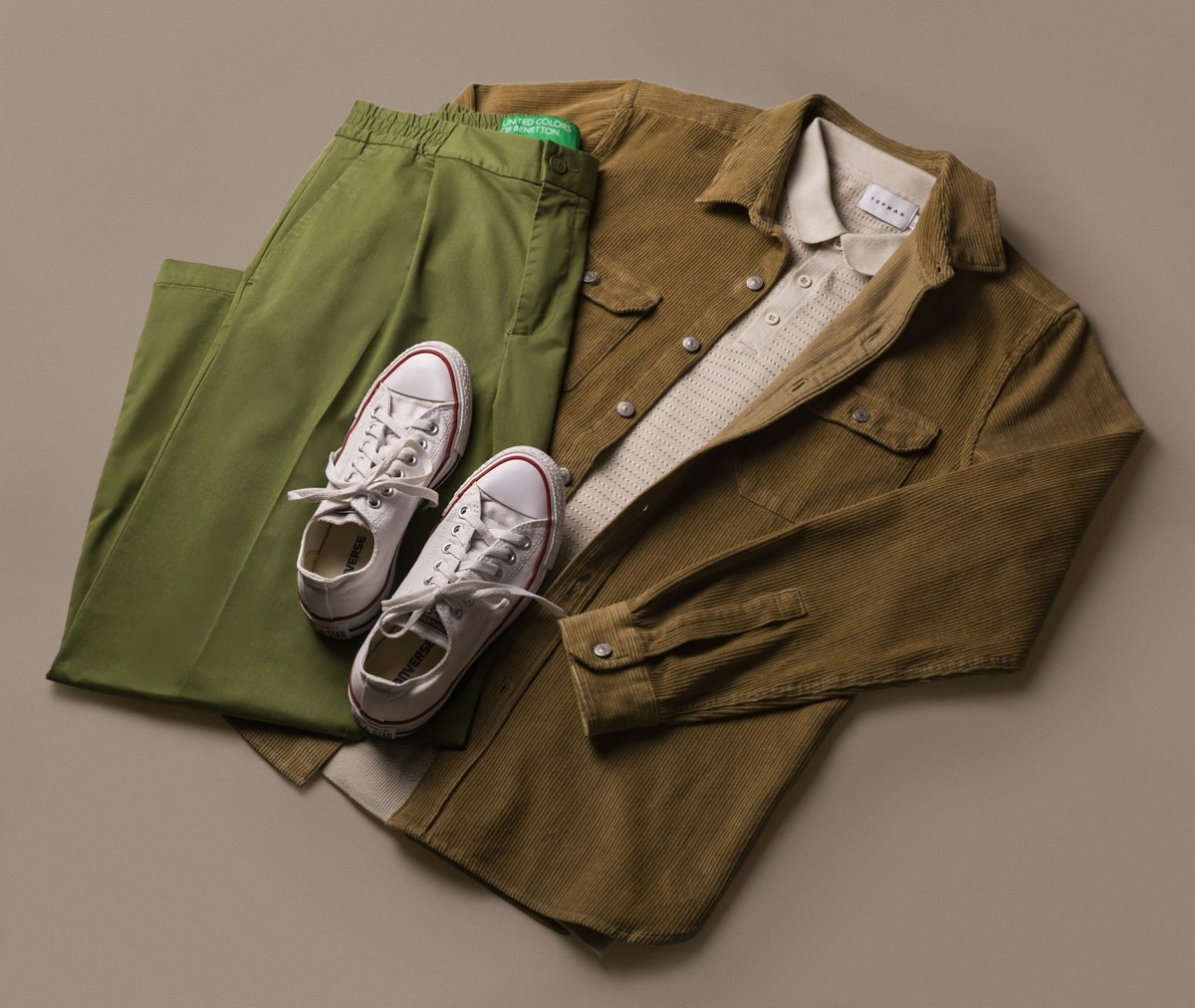 В первом образе нет ярких акцентов и броских оттенков. Но при этом он смотрится интересно за счет различных типов тканей: вельветовая рубашка песочного цвета и футболка-поло из трикотажа делают look фактурным и необычным. А в сочетании с широкими хлопковыми брюками получается идеальный комплект для длительных прогулок.