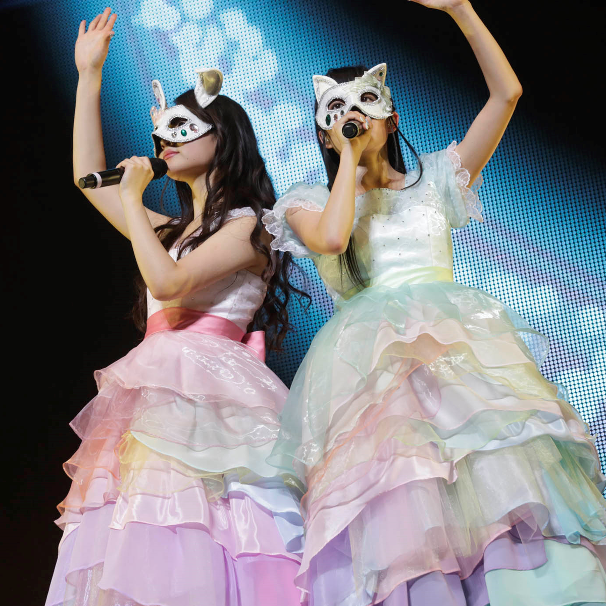 На выступлениях участницы носят маски. А на всех рекламных материалах изображены нарисованные в стиле аниме девушек.