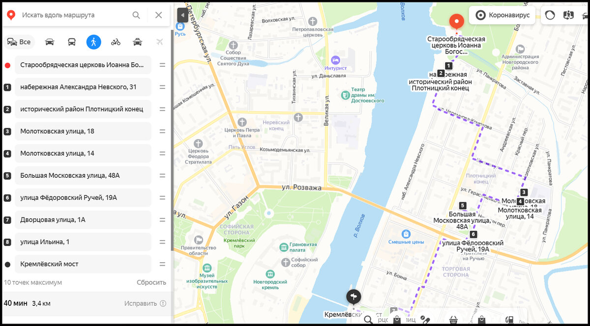Великий Новгород – город белостенных церквей, осмотреть которые за один день не удастся, настолько их много. Сегодня пройдёмся по Плотницкому концу (району) Новгорода, что на Торговой стороне. На такую прогулку уйдёт примерно часа 3, если вы будете заходить в работающие церкви и фотографировать. Карта здесь, или на фото. Плотницкий конец и Фёдоровский ручей Плотницкий конец выделился из Славенского конца в отдельный район в конце XII века. А своё название – Плотники он получил по наименованию Плотницкого ручья, который позже переименовали в Фёдоровский ручей по названию церкви XIV в. Фёдора Стратилата на Фёдоровском ручье. В месте впадения ручья в Волхов в середине ХХ в. построили автомобильный мост, а ручей убрали в трубу – так появилась улица Фёдоровский ручей. Набережная Александра Невского Начнём прогулку с набережной Александра Невского, появившейся в 1968 г. Это любимая зона отдыха горожан, отсюда открывается красивый вид на Софийскую сторону. Перед густыми деревьями парка