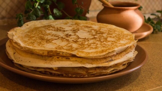 Когда есть необходимость испечь блины без яиц на молоке, можно использовать следующий рецепт. В этом случае они получаются тонкие с дырочками.