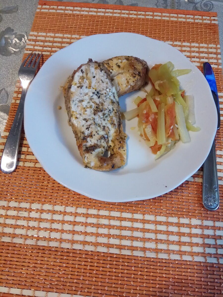 Стейки морского окуня в маринаде из пряностей, запеченные в духовке.