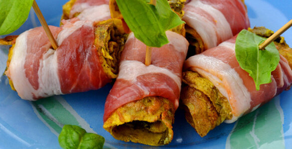 Рулетики из омлета в беконе –это оригинальный завтрак и отличная закуска для праздничного стола. Благодаря сочности и вкусу, бекон стал излюбленным компонентом для салатов, яичниц, супов и закусок. Бекон имеет высокую калорийность и благодаря этому, блюда с ним получаются сытными. Бекон богат высоким содержанием белка, натрием, калием, фосфором и другими минералами. Они улучшают сердечно-сосудистую, костную и нервную системы. Для приготовления этого блюда нам понадобится: Приготовление: Красный репчатый лук очистите и измельчите. Пассируйте его на сковороде с растительным маслом. Яйца слегка взбейте с молоком и солью. Залейте этой смесью подготовленный лук и накройте крышкой. Готовьте омлет на умеренном огне в течение 12–15 минут. Остудите омлет и нарежьте его на полоски. Бекон нарежьте так же на полоски. Отдельно подрумяньте их с двух сторон на сковороде. Слегка смажьте полоски бекона тонким слоем горчицы. Сверху на них выложите полоски омлета и сверните их в рулетики. Закрепите