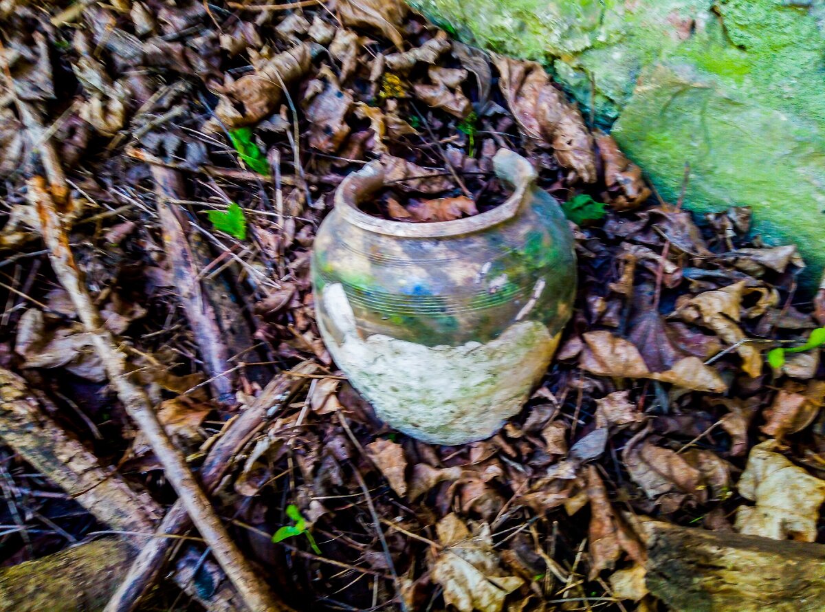 Мы вместе с блогером Александром с канала "Мир прошлого" продолжали идти по глухой деревне. Увидели у дороги заросли и решили их осмотреть. Обычно в таких зарослях могут находиться заброшки. И там действительно стоял заброшенный дом. Однако вход в него был завален досками, упавшими с обрушившейся крыши, и внутрь мы попасть так и не смогли. Уже собирались уходить оттуда и продолжать наш путь дальше, как вдруг заметили лежащие в листве старинные глиняные горшки и крынки. Конечно, сохранность у них была не очень, все они были так или иначе надколоты. Но тем не менее, я все равно их вам покажу. Вот такой, например горшок. От него была отколота почти половина. Но, тем не менее, большая его часть сохранилась, и можно прекрасно увидеть, как он выглядел. Рядом с этим горшком мы увидели крынку. Она была почти целая, чуть-чуть только треснула в нижней части. В кринках обычно в деревнях хранили молоко или сметану. Рядом лежала еще одна крынка, но горлышко ее, к сожалению, было отколото. А вот чт