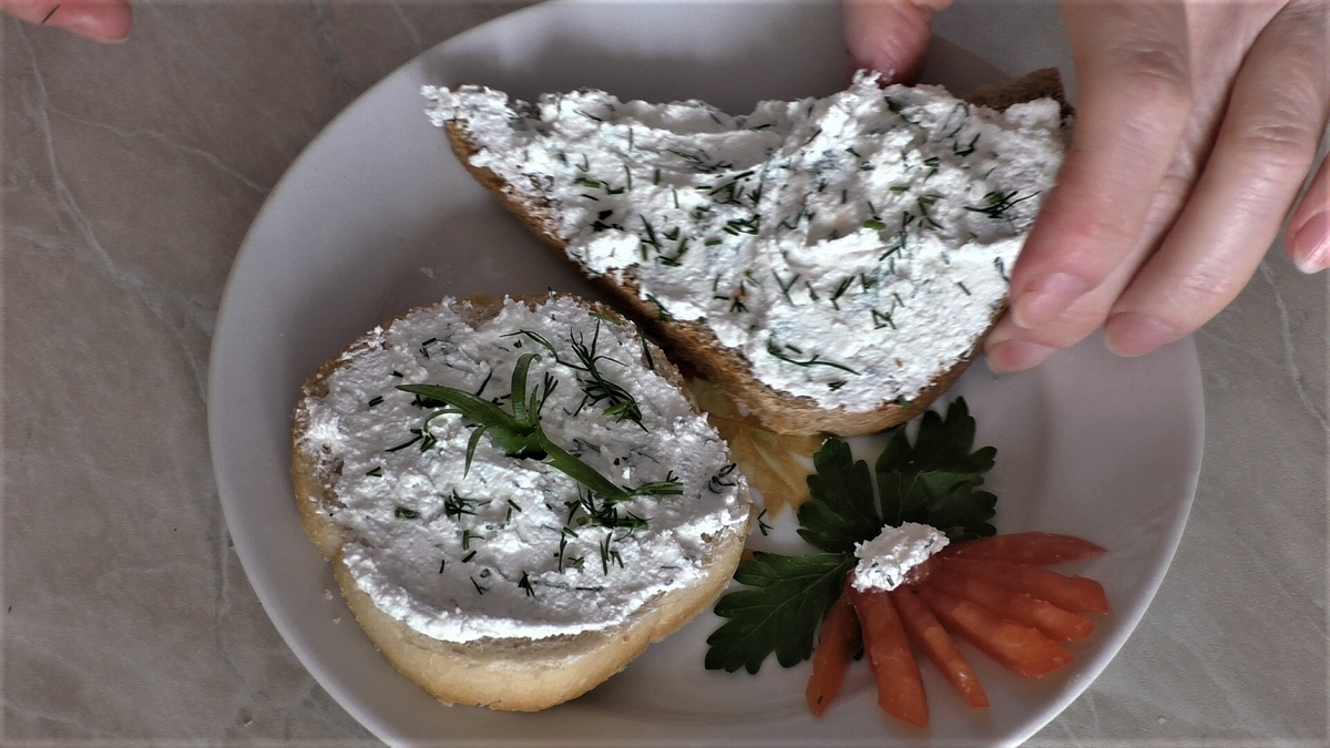 Намазываю творог на хлеб, все готово, можно есть. Поверьте – это очень вкусно, отличный вариант для завтрака.