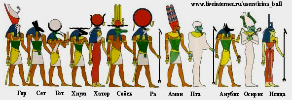 Амон – бог солнца. бог солнца. Бога изображали в виде человека, со скипетром и в короне, с двумя высокими перьями и солнечным диском. Анубис – бог – покровитель мертвых, создатель погребальных обрядов, сын бога растительности Осирис и Нефтиды, сестры Исиды. Анубиса изображали в виде человека с головой шакала или дикой собаки Саб черного цвета. Апис – бог плодородия в облике быка с солнечным диском. Апис считается Ба (душой) бога Птаха, покровителя Мемфиса, а также бога солнца Ра. Живым воплощением бога являлся черный бык с особыми белыми отметинами. Атон – бог – олицетворение солнечного диска. Атон изображался в виде солнечного диска с лучами, которые заканчивались кистями рук, держащими знак жизни анх, символ того, что жизнь людям, животным и растениям дана Атоном. Баал – в западносемитской мифологии бог бури, грома, молний, дождя, связанного с плодородием. В египетской мифологии Баалу соответствует Сет. Геб – бог земли, сын бога воздуха Шу и богини влаги Тефнут. Детьми Геба были Ос
