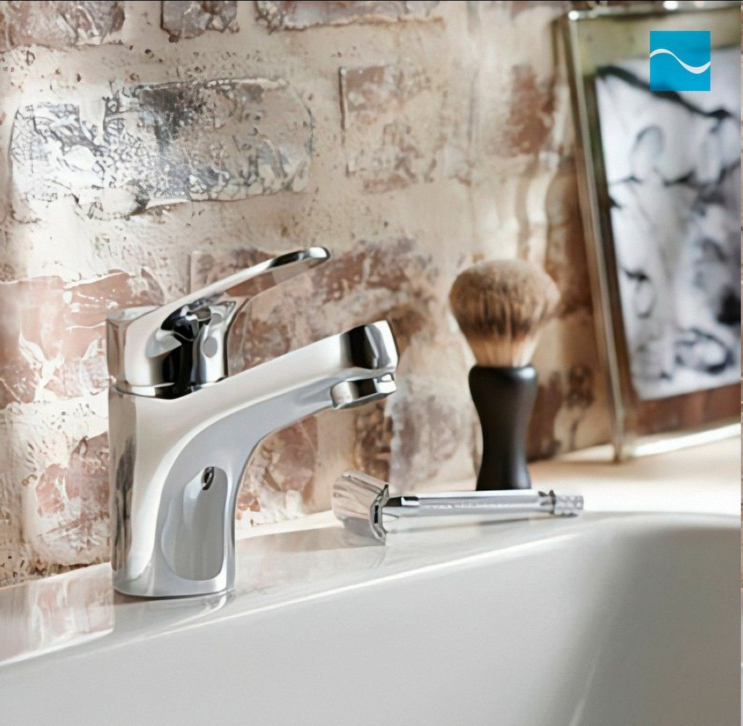 Округлую раковину гармонично дополнит смеситель с изящными изгибами. Геометрический стиль сантехники совмещайте со смесителем угловатой формы.
