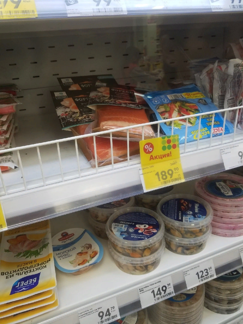 Удачно заехала в Пятерочку за продуктами. Появились новые скидки и акции на многие товары. Делюсь с вами обзором! По хорошей цене можно взять рыбку форель - 189 рублей. Вкусная! Чай Саито по акции 1+1. За одну упаковку 62 рубля. Сыр твердый от Простоквашино Тильзитер 122 рубля Также хорошая скидка и на твердые сыры "Белебеевский" 119 рублей и сыр Никол.Сыроварни 118 рублей 200 гр. Много акций 1+1 в холодильнике с мясными изделиями. Бекон Дымов 1+1 79 рублей за штуку. Колбаса Вязанка 1+1 Классическая. Сосиски стародворские 1+1 99 рублей за штуку 400 гр в упаковке Сосиски баварские Стародворье 1+1 99 рублей за упаковку. Колбаса Тавр Салями Финская 1+1 99 рублей. Молоко от Агрокомплекса в бутылке 900 мл 57 рублей Кефир Коровка из Кореновки 2,7% 450 мл 31 рубль. Много скидочек и на шоколадки. Мой любимый белый и темный шоколад "Воздушный" сейчас по выгодной цене 42 рубля. "Россия щедрая душа" - 39 рублей. Имбирное печенье с кунжутом по карте 49 рублей 300 гр. Со скидкой можно попробов