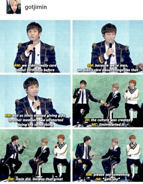 Намджун: -Раньше нас не волновали дни рождения, потому что мы мужчины и нас такие вещи не волнуют, но когда Чимин стал дарить подарки мемберам, мы все стали делать то же самое