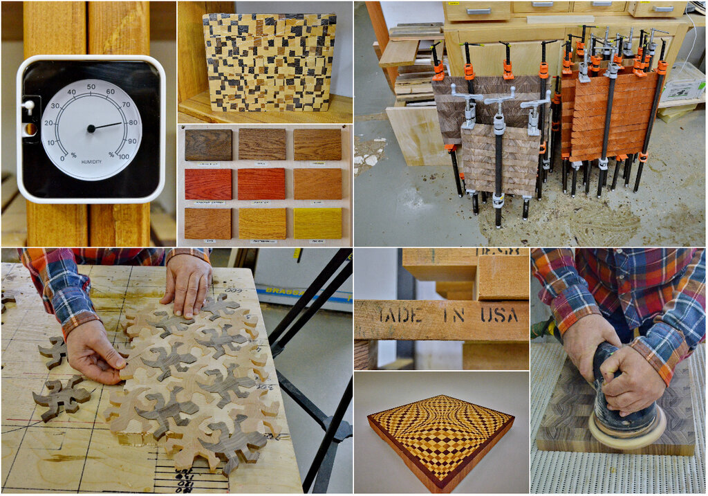 Мастер берет простую доску, обрабатывает ее, выравнивает грани. Затем доска режется на части, которые поворачиваются торцовой частью и склеиваются. Причем склейка делается не в произвольном порядке, а специальным образом, чтобы годичные кольца были направлены в противоположные стороны, это предотвратит доски от деформации при изменении влажности.