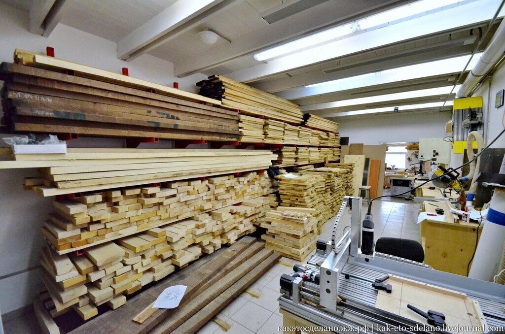Как театр начинается с вешалки, так и мастерская, где делают деревянные изделия начинается со склада, где лежит древесина. К нашему мастеру, о работе которого сегодня пойдет речь она поступает в готовом виде, сушеной при определенной температуре несколько лет. Свежую древесину использовать для производства досок нельзя, так как готовое изделие будет деформироваться со временем от усушки.