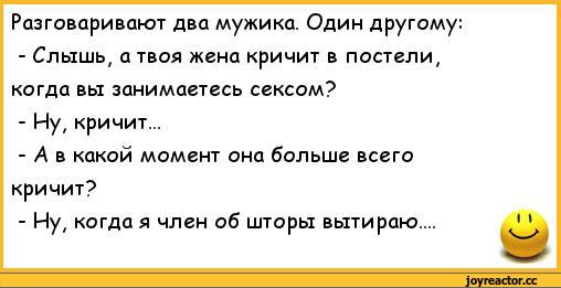 Все из открытых источников Прилетают на Марс немец, американец и украинец. Тут их марсиане взяли в полон и говорят: - Кто выпьет нашей водки, почешет за ушком дракона и отымеет марсианку того отпустим. Подходит Немец. Хряпнул чарку, шатается, шатается, бух упал "умер". Подходит Американец - хряпнул чарку и стоит шатается и говорит: - Ну где там ваш дракон. Вкинули его в клетку. Тут шум крик гам и тут тишина, и никого нет умер. И тут наступила очередь Украинца. Хряпнул чарку ... вкинули его в клетку тут шум, гам, крик и тишина... И тут выходит Украинец вытирает рукой лоб и говорит: - Где там марсианка, которой за ушком почесать? + – А когда у тебя последний раз был секс? – Дай календарик – За какой год? + Где я вам напасусь столько мужиков? - ворчал Дед Мороз, укладывая вибраторы в новогодние подарки... + Приводит мама своего сына к врачу: - Доктор посмотрите, у моего сына что-то с писей. Доктор смотрит: - Так, с этого момента писю называем членом и начинаем лечить сифилис.