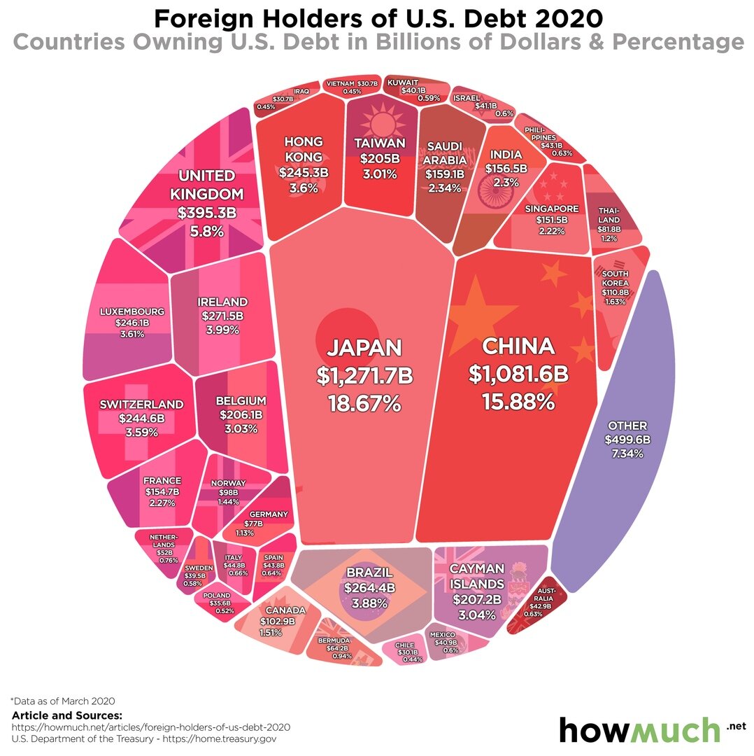 📊 На диаграмме - страны-держатели долга США, инвестировавшие свои резервы в гособлигации (трежерис). Иностранные государства держат 30% всего американского госдолга, остальное принадлежит местным частным инвесторам, ФРС и правительству. 📉 Доходность самых популярных 10-летних бумаг сейчас в районе 0.7% годовых, что на 60% меньше, чем в начале 2020 года. Но Центробанки и инвесторы идут в трежерис не за прибылью, а за кредитным качеством. В общем случае - чем хуже дела в мировой экономике, тем выше спрос на американский госдолг, и тем ниже его доходность. Второй причиной низкой доходности стало понижение ставки ФРС до 0-0.25% в марте этого года. ⛩Недавно среди держателей долга сменился лидер - им стала Япония, которая хранит в этих бумагах $1,272 млрд с долей 18.67%. Китай переместился на 2-е место, и причину искать долго не придётся: он находится под давлением со стороны США в истории с противостоянием двух крупнейших экономик. ще год назад на этой диаграмме присутствовала Россия. Н