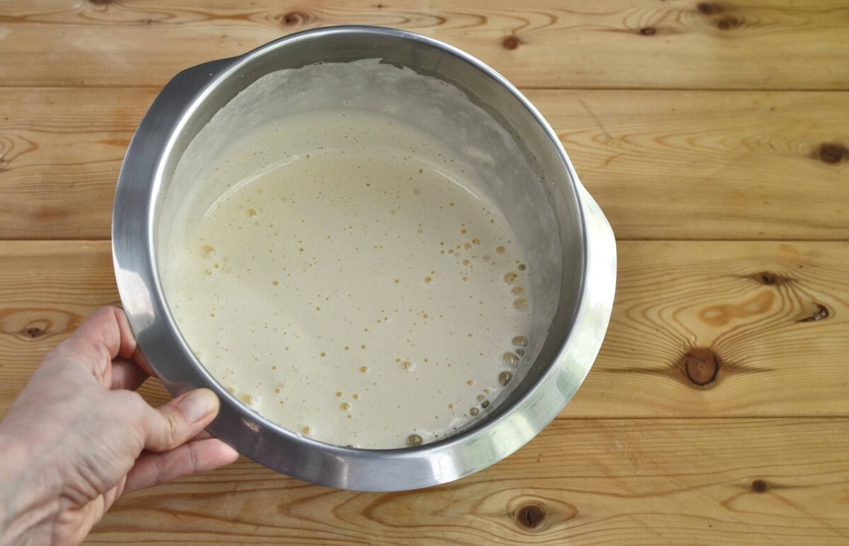 Шаг 2. Частями вводим просеянную муку в жидкую смесь, аккуратно перемешаем, чтобы сохранить пышность теста.