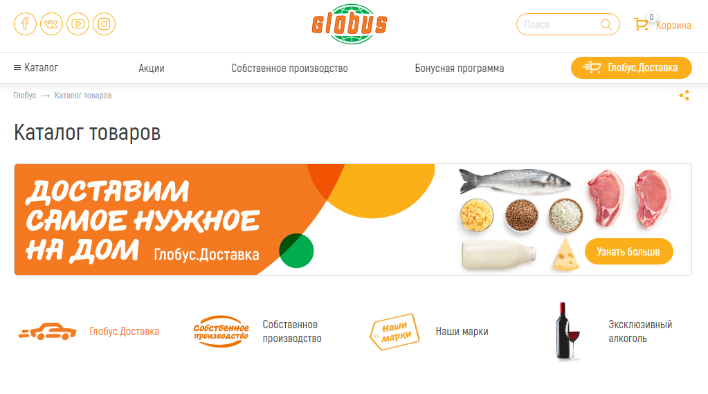 Мы выделили на сайте globus.ru специальный каталог «Глобус Доставка». В нем собрали продукты, товары для дома и средства гигиены.