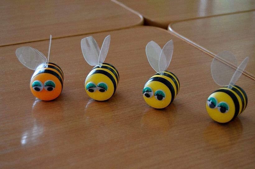 Для создания пчелки понадобится: Коробочка из под игрушки из нового киндер-сюрприза, пластиковая бутылка, изолента черного цвета, нитка за которую в будущем будем подвешивать пчелку, ножницы с острыми кончиками. В своей работе, представленной на фото я дополнительно использовала изоленту красного цвета и корректор (штрих). 1. Берем пустой контейнер (яйцо из под игрушки), открываем его и разрываем по линии до конца (до кругляшка); 2. Вырезаем из пластиковой бутылки длинные прямоугольники, складываем их пополам и от линии сгиба вырезаем крылья пчелы (крылья получаются соединенными между собой); 3. Отрезаем нитку необходимой длины, связываем её концы между собой; В "попе" будущей пчелки проделываем дырку острым краем ножниц. Вырезаем из бутылки "жало" треугольной формы и острым концом изнутри вставляем жало "на место". Жало прочно застревает в отверстии. 4. Вставляем под оторвавшуюся часть от контейнера усики, крылья, веревочку. Закрываем контейнер; 5. От черной изоленты отрезаем к