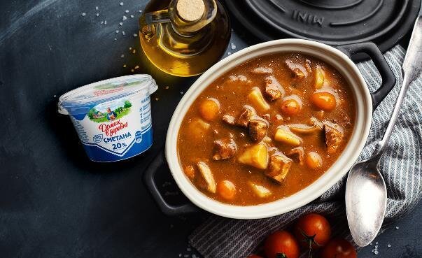 2. Сметану выбирайте вкусную и густую – ту же, которую добавляете в борщ для вкуса. В этом рецепте я использовал натуральную сметану «Домик в деревне»: она почти всегда есть в холодильнике, и я точно знаю, что она придаст соусу насыщенный сливочный вкус.
