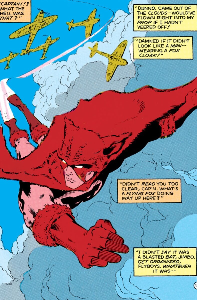 Летучая Лисица (англ. Flying Fox) был коренным жителем Канады. Его убили нацисты, но он магическим образом воскрес, получив маску и плащ, позволившие ему летать и становиться невидимым. Также Лисица мог испускать огонь из рук. Он отправился в Америку, вступил в “Звездный Эскадрон” и стал сражаться с нацистами. ПЕРВОЕ ПОЯВЛЕНИЕ В КОМИКСАХ: Young All-Stars #1 (июнь 1987 года) СОЮЗНИКИ: Железный Мунро, Ярость ВРАГИ: Ось Америки, нацисты Узнайте больше о Летучей Лисице на сайте vcomicse.ru.