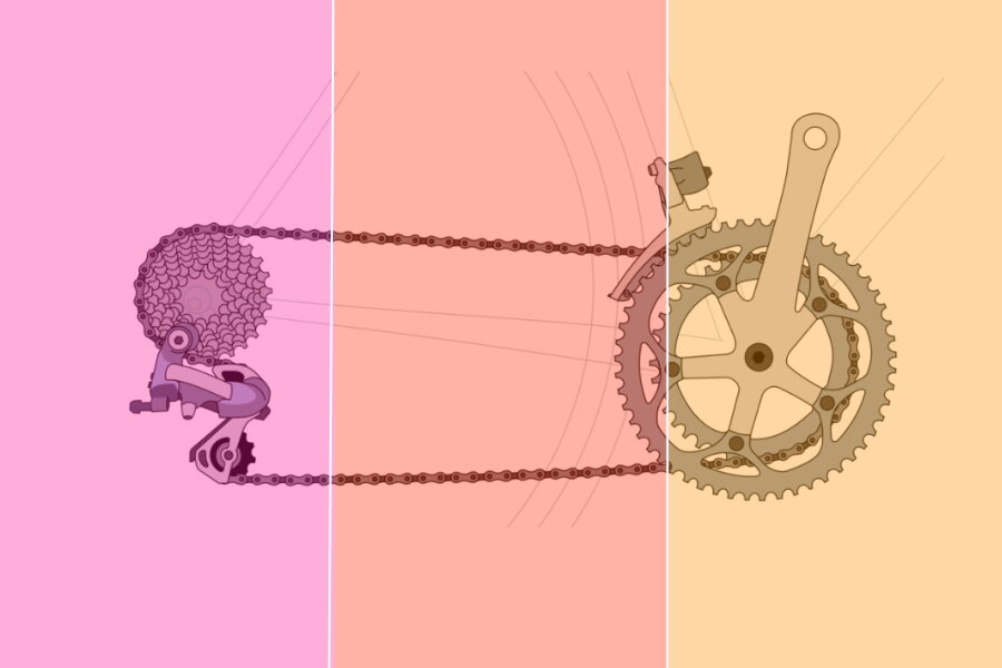 У большинства современных велосипедов, которые не используются в трековых гонках, и не принадлежат к fixie-культуре, скоростей действительно больше одной, причём обычно значительно больше. Для того, чтобы обеспечить переключение скоростей в трансмиссию добавлены переключатели. Давайте посмотрим на это сбоку.