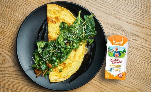 2. Чтобы омлет получился воздушным, особенно важно в этом рецепте выбрать качественные сливки. Для этого омлета я беру натуральные сливки «Домик в деревне» – часто использую их в других блюдах, они отлично подходят для домашних рецептов.