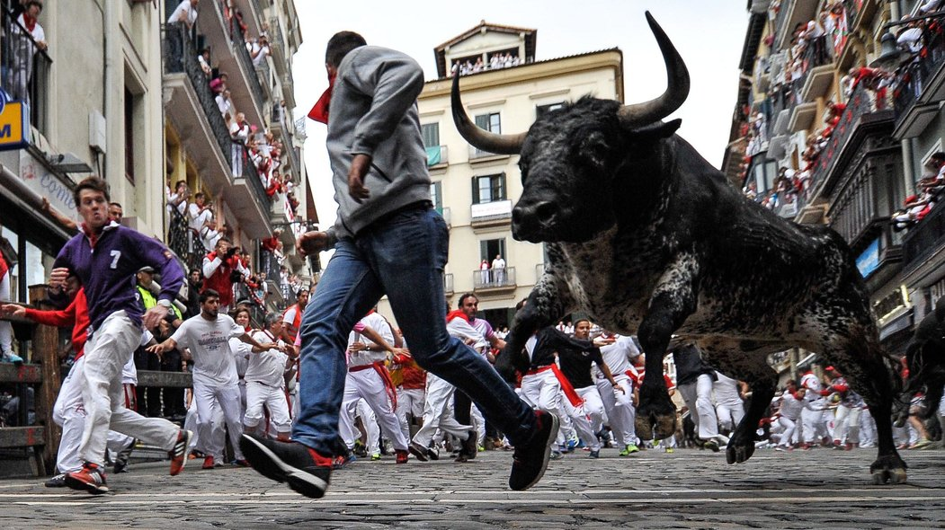 Необычное и крайне опасное развлечение появилось в Испании в городе Памплоне вместе с праздником, посвященному некогда спасшему Памплону от чумы епископу Святому Фермину. Изначально религиозный праздник со временем превратился в пышные народные гулянья, которые растянулись на 9 дней. Среди развлечений концерты и спектакли, фейерверки, парады масок, красочное шествие со статуей Сен-Фермина, обливание толпы шампанским, но все же самое долгожданное и запоминающееся — забег с быками.