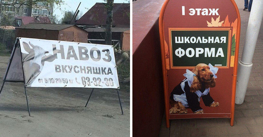 Как известно, во имя привлечения внимания к своим товарам и услугам люди способны на совершенно невероятные проявления фантазии. Мы вроде бы уже привыкли и относимся к этому как к норме окружающей нас жизни. Но иногда всё-таки стремление выделиться из толпы своими табличками выходит на такой уровень, что требуется какое-то время для того, чтобы переварить увиденное. К тому же, если то или иное средство письменного обращения к общественности не несёт очевидной цели, его восприятие совсем уж дает сбой. Если вы не совсем поняли, о чем идет речь, то взгляните на это! 1 2 3 4 5 6 7 8 9 10 11 12 13 14 15 Если у вас есть интересные примеры рекламы или других сочетаний которые вызывают улыбку или недоумение, пишите и размещайте их в комментариях.