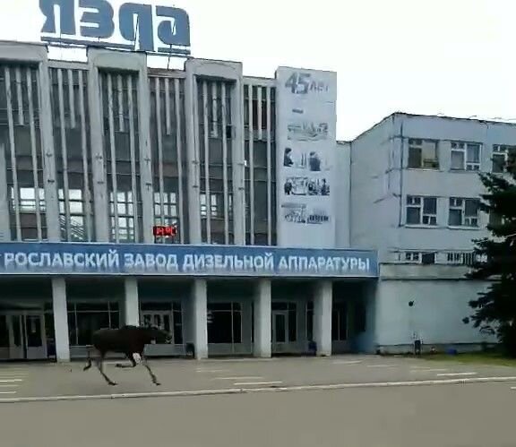 Лось разгуливает возле заводоуправления Ярославского завода дизельной аппаратуры. Животное буквально прогарцевало мимо рабочих и отправилось в сторону автобусной остановки. Лесных насаждений в этих местах достаточно, потому лось явно побежал туда.