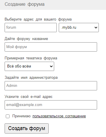 Что такое форум? Веб-форум — интернет-сервис (платформа) для общения между пользователями интернета (более двух участников) на одну тему или на несколько тем (зависит от специализации форума). Выбор платформы для создания бесплатного форума Поискал я неплохие варианты и нашел: https://mybb.ru/ https://www.forum2x2.ru/ Я буду создавать тестовый форум на первом варианте, а именно MYBB. 1. Адрес форума это - URL Единый указатель ресурса — система унифицированных адресов электронных ресурсов, или единообразный определитель местонахождения ресурса (файла). Используется как стандарт записи ссылок на объекты в Интернете... Допустим, я сделаю yandex. mybb. ru (значит когда я перейду по этой ссылке, то меня перекинет на наш форум). 2. Название форума. 3. Тематика форума. Ставите, то о чем будет ваш форум. 4. Имя админинстратора. Когда Вы создадите свой форум, то Вам потребуется в него войти. На этом моменте и понадобится имя которое Вы задали. 5. Электронная почта. В это окно Вам необх
