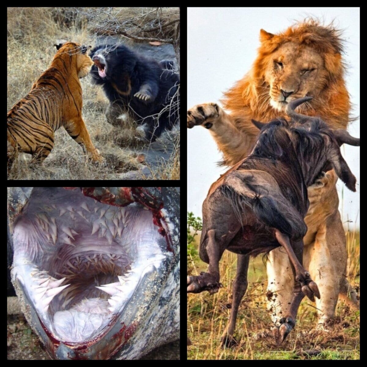Каждая капля воды, каждый кусочек пищи является полем битвы. И дикие звери привыкли к этой борьбе. За многие века эволюции, они отточили свои навыки убивать и защищаться. Быстрота атаки, длинные клыки, стальные когти, смертоносные жала - это дикая природа. Жестокая и беспощадная. Эти фотографии, покажут вам как звери борются за право жить. 1. Крокодил пожирает бычью акулу 2. Теперь он жертва 3. 4. 5. Удачная охота леопарда 6. Стремительная атака 7. Царь зверей 8. Охота прайдом 9. Отбился от стада и тут же поплатился 10. Борьба за территорию 11. Волк и не менее грозный хищник - росомаха 12. Сплошной комок ярости 13. Цепкие когти орла 14. Австралийский клин-белохвост поймал лису 15. Гигантские смертоносные шершни 16. Ядовитый и очень опасный жёлтый скорпион 17. Добыча акулы 18. Косатка в погоне за дельфином 19. Охота удалась 20. Стремительный и жестокий морской черт (рыба-удильщик) 21. Медуза - Морская Оса. Один из самых ядовитых обитателей океана 22. Когда сильно проголодался 23. Так в
