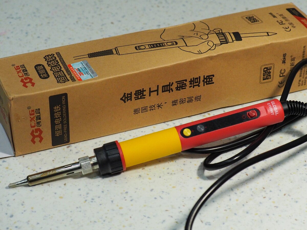 - Переосмыслил (прочтя перевод текста в оригинальной инструкции прилагаемой к паяльнику ("станции") CXG E110 Вт (попробовал припять антенный кабель к самодельной цифровой антенне разработка Харченко). Нагрел паяльник, выставив 500 С, первый нагрев по тестеру показал прогрев жала до 447 С, (при выставке температуры на 500 С, "команда - отклик" имеет задержку 8 секунд). В инструкции запрещается чистка жала паяльника механическим способом, стало понятно почему - пренебрег инструкцией, потёр жало об абразивный брусок при облуживании хромированного жала: "взял брусок абразивный , потёр жало паяльника, мокнув в канифоль цепанул наконец каплю припоя". Приглядевшись на следы от жала паяльника оставленные на абразивном камне, обнаружил: жало не медное а скорее всего латунь - окуеть. Сходил в магазин Алми, купил 2-а медных "жала", по цене 85 руб, оригинальные аналогичные (хромированные) стоят : 120 руб. Купил нейтральный флюс. (Оригинальная инструкция в коробке на английском и китай