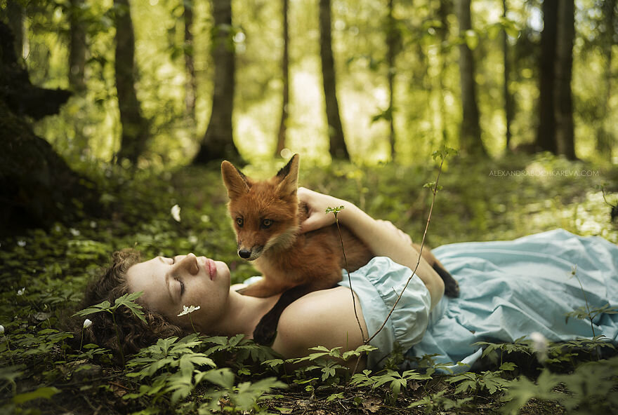 Известный фотограф из Санкт-Петербурга Александра Бочкарёва питает слабость к работе с рыжеволосыми моделями. Но часть её работ содержат двойную порцию огненно-рыжей красоты, потому что перед объективом её камеры предстают сразу две рыжеволосые красавицы - девушка-модель и самая настоящая лиса.
