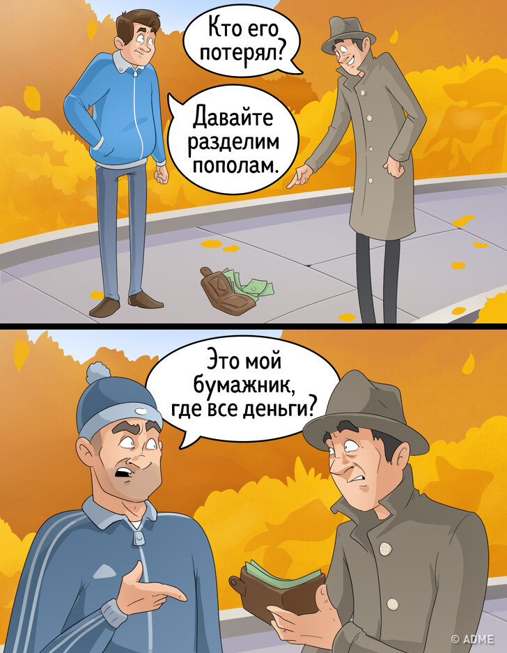 Самая распространенная схема. Вы идете по улице и замечаете у себя под ногами чей-то кошелек, полный денег. Человек, волшебным образом оказавшийся рядом с вами, предлагает поделить находку пополам. Его уговорам, как правило, сложно что-то противопоставить, поэтому тот забирает половину денег и убегает. В скором времени находится «владелец» кошелька, который требует возместить ему всю сумму. Естественно, он и тот переговорщик работают в связке.
