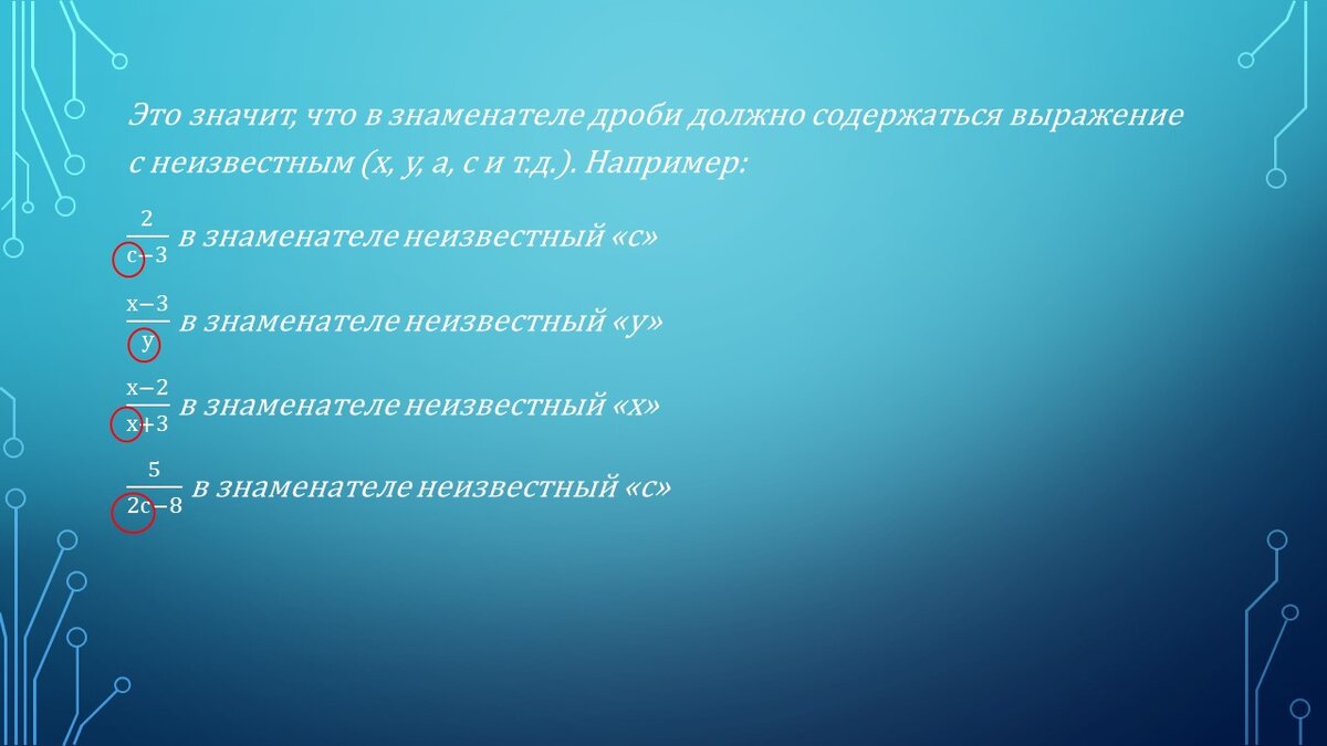 Ответы на вопросы после параграфа. 1. Чем отличаются дробные выражения от целых? Они содержат деление на выражение с переменными. 2. Как вместе называют целые и дробные выражения? Рациональные. 3. Какие значения переменных называют допустимыми? Все значения переменных, при которых это выражение имеет смысл. 4. Какие дроби называют рациональными? Это дробь, числитель и знаменатель которой - многочлены. 5. Отдельным видом каких выражений являются рациональные дроби? Рациональных выражений 6. Какой многочлен не может быть знаменателем рациональной дроби? Нулевой многочлен. Смотри пояснение к вопросу 3. Упражнения №1 Пояснение: Целые выражения – это выражения из чисел и переменных, которые составлены с помощью действий сложения, вычитания и умножения, а также деления на число, отличное от нуля. Это значит, что в числителе дроби может быть любое выражение с любыми действиями, а вот в знаменателе может быть только число, и оно не должно быть 0. Значит находим все дроби в которых знаменат