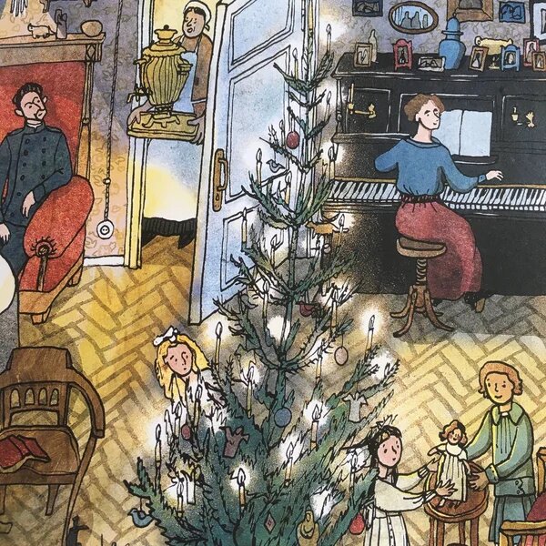 Кстати, с музыкой у книги особая связь. Как писала иллюстратор Анна Десницкая в своем инстаграме (@anyadesnitskaya), создавая картинки про разные года, она старалась параллельно слушать что-нибудь, характерное для эпохи и настраивающее ее на определенный лад. Так, иллюстрации про 1937 год рисовались под пропагандистские песни про Ленина и Сталина, про 70-е – под Галича, а про 90-е – под Цоя. Отрывки из некоторых песен появились в книге, а иногда даже влияли на появление каких-то предметов на картинке. Например, рисуя иллюстрации для разворота про первую зиму после начала Великой Отечественной войны, художница слушала поэму Давида Самойлова 1941 года «Снегопад» в исполнении Райкина. Ей очень хотелось нарисовать такой же снегопад, какой описывался в стихотворении, однако по условию композиции книги, окна не должны были изображаться на иллюстрации. Поэтому на развороте появился шкаф, в зеркале которого отображаются заклеенное крест накрест окно и тот самый снегопад. И таких интересных, не сразу заметных, деталей в книге очень много.