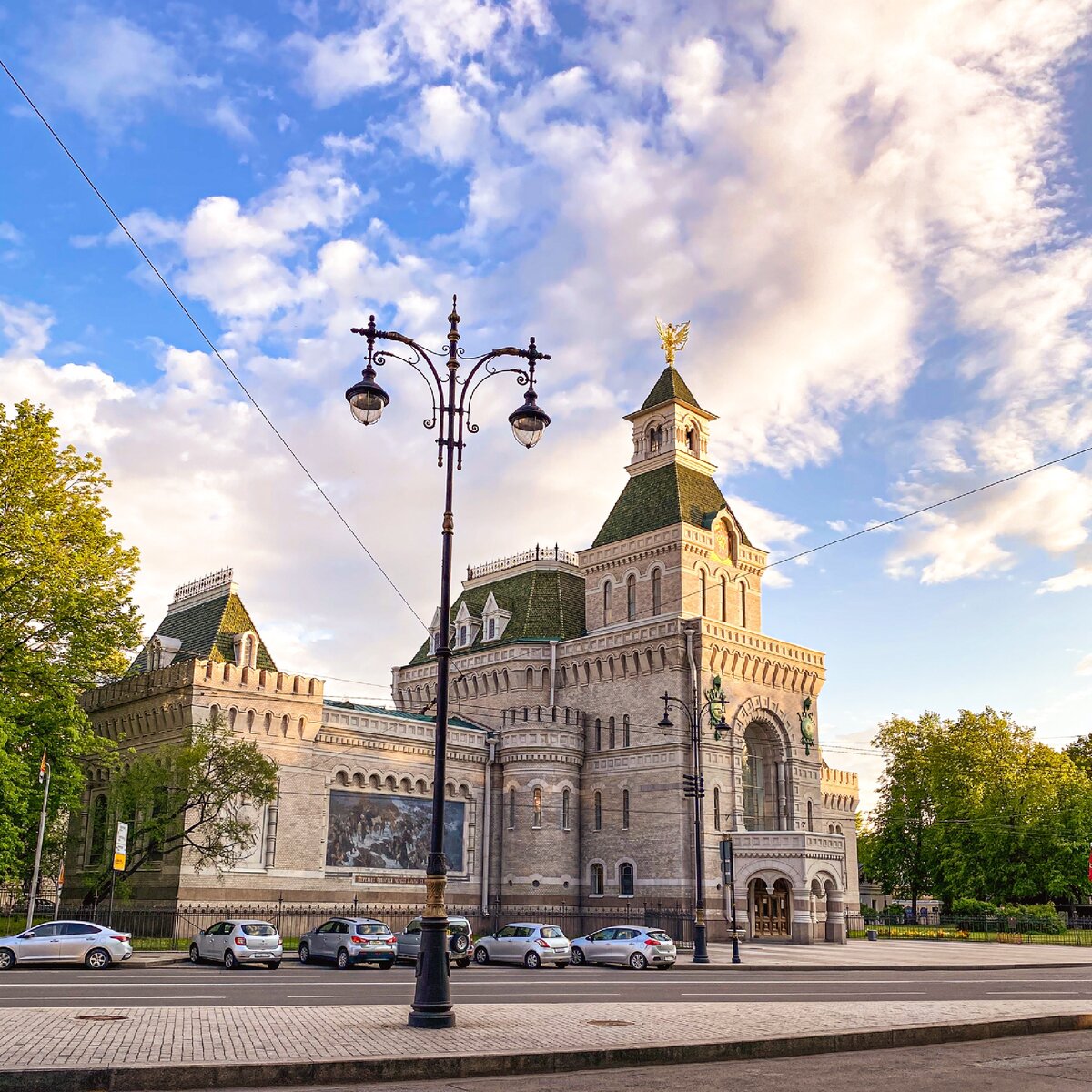 Здание Музея Суворова у Таврического садика, построенное в начале ХХ века, резко выделяется на фоне архитектуры соседних зданий. В январе 1901 г. состоялось рассмотрение конкурсных проектов, но ни один не был принят по причине их высокой стоимости. Новый проект заказали фон Гогену и Гримму. Из нескольких вариантов Император утвердил тот, что мы сейчас можем наблюдать на углу Кирочной и Таврической - из светлого кирпича с огромными мозаиками, изображающими переход Суворова через Альпы и его выезд из села Кончанского в Итальянский поход, и шатровыми крышами с зеленой черепицей - как в Кремле. Музей открыли в 175-ую годовщину со дня рождения полководца - 13 ноября 1904 года.