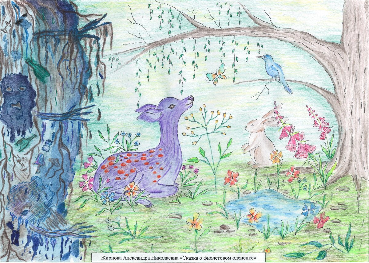 Ранней весной, в тенистом еловом лесу, под старой корягой, у мамы-оленихи родился малыш-олененок. Это был необычный олененок, потому что его мягкая шубка была окрашена не как у всех оленят, она была фиолетового цвета, с яркими оранжевыми пятнышками. Мама-олениха отдыхала, а ее малыш пытался впервые встать на свои тоненькие длинные ножки. На ветке ели, под которой родился олененок, сидела старая болтливая сорока. Она была очень удивлена цветом шерстки олененка, и, обрадовавшись, что сможет первой разнести по лесу такую необычную новость, во всю прыть полетела прочь, беспрестанно стрекоча на лету.