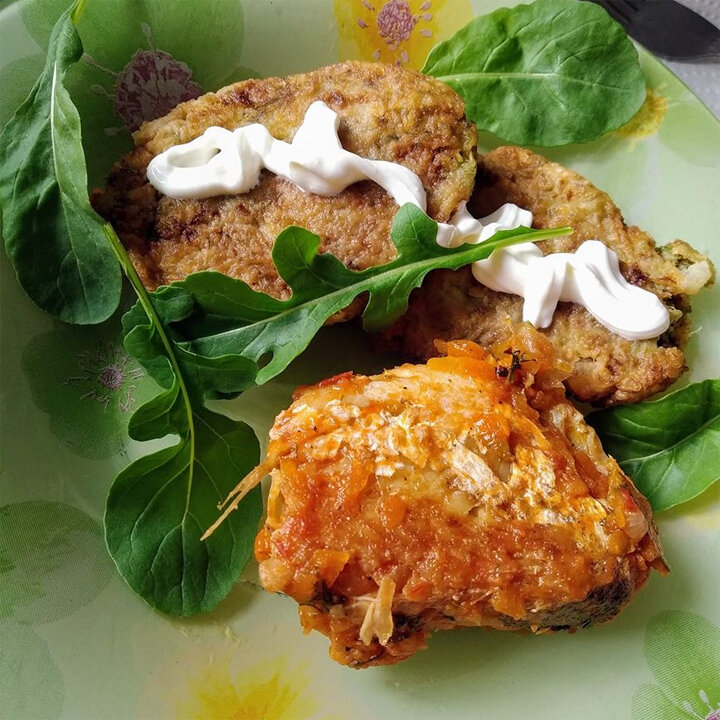 Сегодня так: хек, тушёный в овощах, а к нему котлетки (оладьи?) из выжимков после отжима сока совыжималкой. Там кабачок, капуста, морковь (немного), и позже добавлен лук, чеснок, специи, яйцо, немного муки. Они приготовлены на сухой сковороде плюс немного воды. Для семьи вполне можно просто жарить на масле. Рыбу я тоже подсушиваю на сухой сковороде, а потом засыпаю шубой из лука, чеснока, томатов, зелени и тушу до мягких косточек. Ну и рукола с подоконника :) Больше общения и рецептов - в группе "Рецепты для диабетиков" в Facebook, или в группе ВКонтакте! Рецепт на странице в Facebook Автор рецепта - Анна Митренко