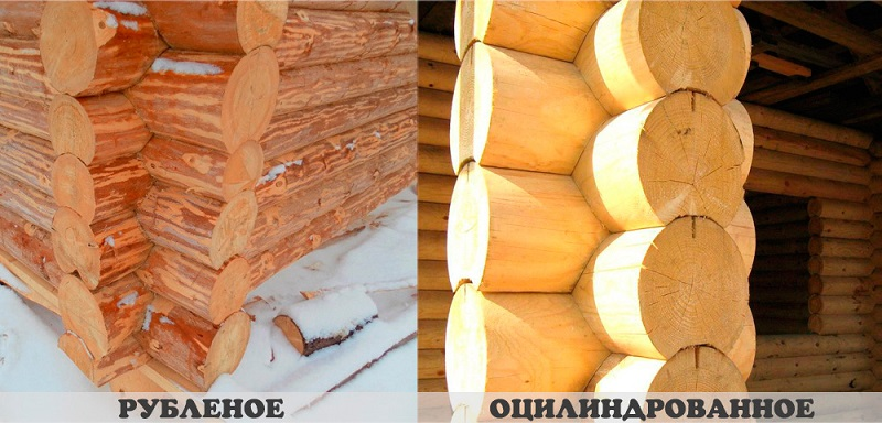 Визуально видно, что рубленное бревно сохраняет индивидуальный шероховатый рисунок, оно разного диаметра, в отличие от оцилиндрованного бревна. Последнее изготавливается промышленно, оно от начала до конца одного диаметра, с бревна снимается защитный слой, поверхность его идеально гладкая и ровная, пазы сделаны заранее.