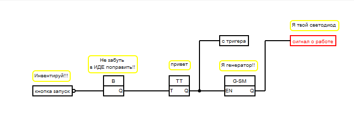 Итак, начинаем собирать код под запись температуры или иных параметров с датчиков на флешку. Вот так выглядит схема запуска команды на запись и остановкой ее. Все дублируется светодиодами. Логика работы. Нажимаем кнопку, она подаёт питание +5в на цифровой вход контроллера. Дальше идёт задержка сигнала, в фл прог она 40мс, в иде я ее сделал на 500 мс. дальше тригер переключает своё состояние с 0 на 1, запускает генератор. Светодиодами мы контролируем начала работы тригера и генератора, как в древние времена "если моргает-значит идет запись!!"