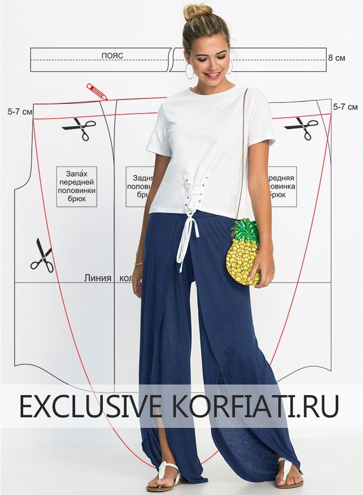 Еще одно неоспоримое достоинство этой модели — она очень быстро и просто моделируется и шьется. Причем шва — всего два! Если у вас есть пара часов свободного времени, смело беритесь за работу, ведь такие брючки будут настоящей находкой! Для моделирования выкройки трикотажных брюк вы можете использовать базовую выкройку брюк-кюлоты или базовую выкройку женских брюк. Если у вас нет готовой базовой выкройки, вы можете скачать бесплатно базовую выкройку женских брюк на 5 размеров. Читать полностью материал на сайте - https://korfiat