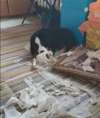 Всем привет! Меня зовут Викки! Мне два с половиной месяца, я еще маленькая. Здесь будет рассказ о моей жизни. Моя порода – бернский зенненхунд. Неделю назад я уехала от мамы и приехала в новый дом. Здесь много всего интересного. Сегодня я расскажу, как прошло мое утро. Только взошло солнышко, я проснулась. Встала, оглянулась, подняла голову, смотрю, моя человеческая мама спит. Странно. Светло, утро, а она спит. Нужно будить. Подошла, положила лапы на кровать: «вставай!». А она почему, то не рада! Говорит, что еще 4 утра, говорит: «иди спать». А как спать то! Попробовала позвать, «Гав» - говорю. А она все свое: «Рано, иди спать». Ну спать я, конечно, не пошла. Решила на разведку по квартире пройтись, что тут есть посмотреть! Игрушки: мячик, кольцо, канат – не интересно. Ими с мамой играть только интересно. А так мячик не убегает, канат никто не перетягивает. Иду, смотрю, дверь, за дверью туалет. Зашла, вижу - рулон, надо брать. Взяла, но маме, наверное, не понравиться, а как интер