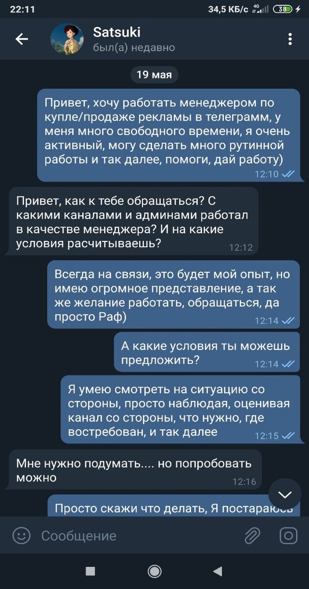 «Привет, хочу работать менеджером по купле/продаже рекламы в телеграмм. У Меня много свободного времени, я очень активный, могу сделать много рутинной работы и так далее, помоги, дай работу)»