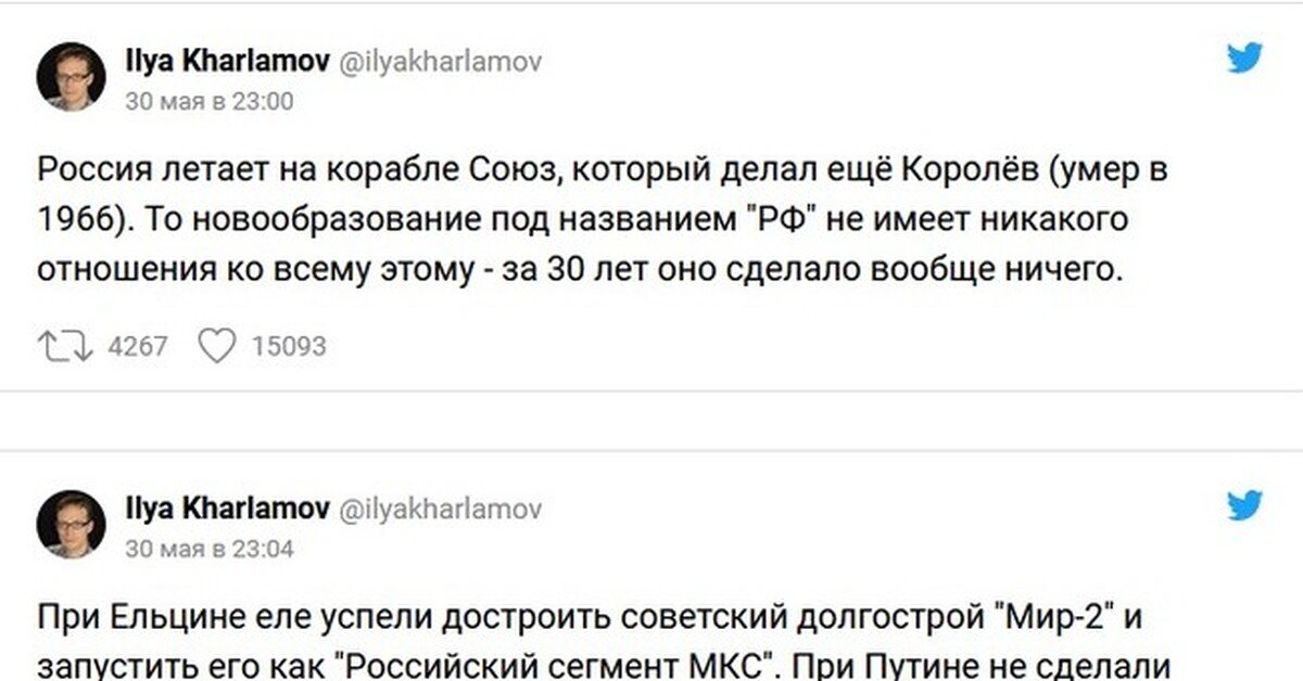 По интернету гуляют Твиты некоего Ильи Харламова, бывшего инженера, работавшего в центре им. Хруничева. Там под два десятка твитов, найти можно на любом паблике про космос, думаю все уже видели. Наверное, многие "патриоты" скажут, что он обиженка, предатель Родины (Рогозин об инженерах, уехавших на запад, пишет под тегом #власовцы ). Про патриотизм и псевдопатриотизм напишу отдельно, что для страны хорошо и что плохо, кто ей друг, кто враг, а кто оказывает медвежьи услуги. Отрицание проблем в собственной стране - это признак псевдопатриотизма. Ведь непризнанную проблему никто никогда решать не будет. Напишите в комментарии, считаете ли вы верным, что в российских предприятиях космической отрасли гора проблем, или думаете, что всё хорошо и отлично, а это западные "тявки" на нас наговаривают. Пишите, мне реально интересно, из кого состоит моя аудитория. А я от себя дополню посты Ильи Харламова, ибо сам имею опыт работы на подобном Хруничеву предприятии. Развал советской системы образован