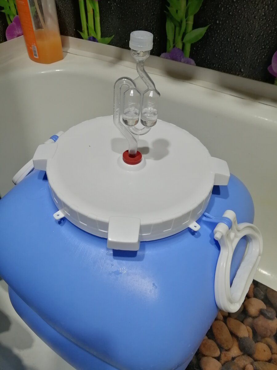Всем привет !!! Хочу с вами поделиться своим первым опытом постановки сахарной браги. И сразу забегая вперед хочу сказать что для абсолютного новичка в этом деле ставить браги из зерна или фруктов наверно рановато. Так вот, купил я пластиковую емкость для пищевых продуктов на 40 литров с большой герметичной крышкой и двумя хорошими, удобными ручками. Просверлил дырку в крышке и установил гидрозатвор. Затем определился с местом для емкости и это ванная комната (в летний период я думаю вполне подходящее место так как температура там 25-26 градусов), а что бы изолировать емкость от самой ванны я подложил под нее пару деревянных брусочков. Я взял 8 кг сахара и 24 литра отстоявшейся воды и грамм 150 изюма, таким образом гидромодуль получился 1:3 и тут многие наверно скажут что это неправильно, но чудо дрожжи "48 universal turbo" съели весь сахар за трое с половиной суток. Брага на вкус очень горькая и не имеет не малейшей сладости, осталось теперь только осветлить и перегнать. О том что