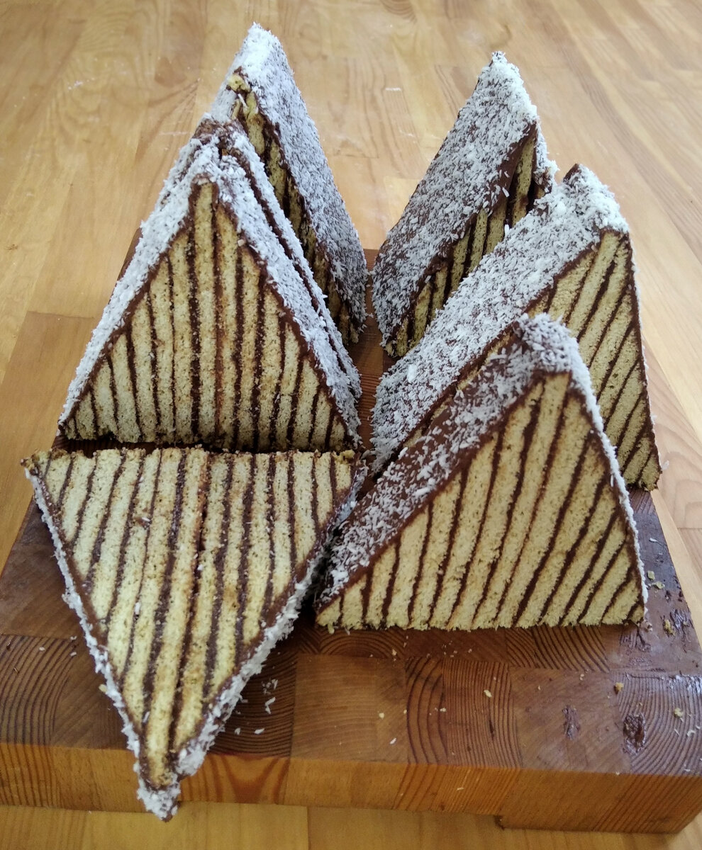 3. Ставим одну часть на торец и разрезаем по диагонали. Боковые части разрезанных треугольников покрываем тонким слоем крема и плотно соединяем, таким образом образуется гора.