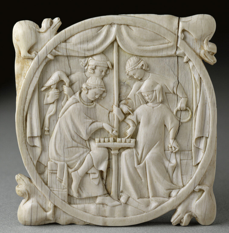 В XII веке на смену широко распространенной среди всех слоев населения игре в кости с Востока пришли шахматы, ставшие привилегией аристократии. Так как играли на деньги, то очень скоро Церковь запрещает игру, но к XIII веку «потерпев поражение в этой партии» ей не остается ничего другого, как создавать нравоучающие трактаты, которые рассматривали игру в шахматы не как портивостояния двух соперников, двух воинов, а как основу для светского воспитания молодых аристократов в отношении социальных слоев общества, а также искусств соблазнения и куртуазной любви. Перед вами луврский экспонат — створка от коробочки с зеркалом, из слоновой кости - частый материал не только для религиозных предметов, но и светских - которые обычно украшалась куртуазными сценами или эпизодами из модных романов. В центре нашего внимания, как и четырех персонажей находятся шахматы; двое играющих — молодой человек из аристократической семьи (его слуга держит сокола, которого могли себе позволить только принцы или ге