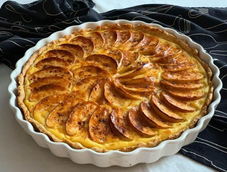 Порежьте яблоки на ноготки, сбрызните оставшимся сахаром, корицей, сбрызните половиной лимонного сока и перемешайте. Выложите раскатанное тесто в форму диаметром 23 см, налейте сливки, положите яблоки и кусочки сливочного масла.