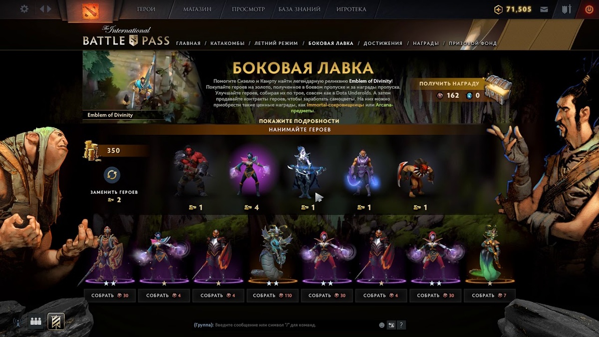 Из данной статьи Вы узнаете всё, что нужно знать про боковую лавку в Battle Pass 2020. В боковой лавке заложена механика из dota auto chess или же dota underlords. Собрав 3 одинаковых героя мы улучшим его до 2 уровня,затем необходимо улучшить еще 2 копии этого героя до 2го уровня и в итоге мы получим 3 уровень героя, который является максимальным,после чего продаем его,и получаем самоцветы в зависимости от разряда, синие или красные. Способы получения золота для Боковой лавки: И так теперь мы знаем, как получить золото. Идём дальше. Что делать с золотом? Кого покупать? В боковой Лавке есть 5 разрядов по 5 героев: 1 Разряд - покупка 1 золото. При продаже даёт Красные самоцветы. 2 Разряд - покупка 2 золота. При продаже даёт Красные самоцветы. 3 Разряд - покупка 3 золота. При продаже даёт Красные самоцветы. 4 Разряд - покупка 4 золото. Продажа макс. лвл даёт Синие самоцветы. 5 Разряд - покупка 5 золота. Продажа макс. лвл даёт Синие самоцветы. Синие самоцветы можем потратить н