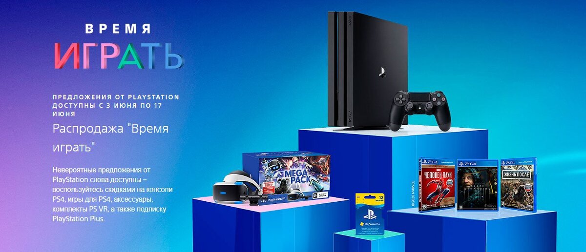Стартовала распродажа «Время играть 2020» В рамках акции снижены цены на множество игр, игровые приставки PlayStation 4, аксессуары и подписку PlayStation Plus. Распродажа началась 3 июня и продлится 15 дней, до 17 июня в онлайн-магазине PlayStation Store, фирменном онлайн-магазине Sony и магазинах партнеров. Среди таких партнёров — М.Видео, DNS, Ozon и многие другие.