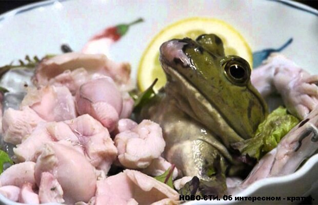 В Китае, Японии и Вьетнаме довольно популярно блюдо, главный ингредиент которого — живая лягушка. Можете полюбоваться, как японка мастерски расправляется с этим изысканным кушаньем. Чаще всего «лакомство» готовят из специально выращенных лягушек, процесс его приготовления несложен — с лягушки снимают кожу, потрошат, затем разрезают на куски и выкладывают на тарелку с гарниром, главное украшение деликатеса — ещё живая лягушачья голова.